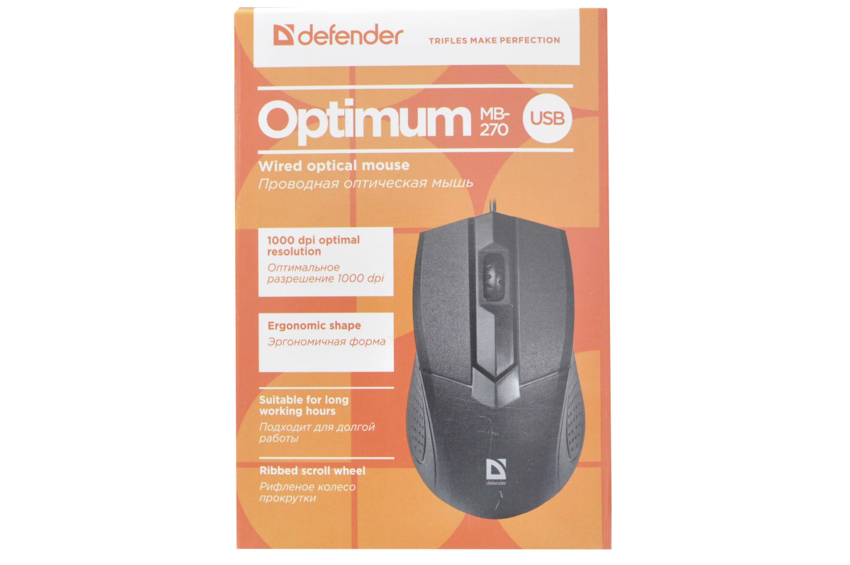 Проводная оптическая мышь Defender Optimum MB-270 черный,3 кнопки,1000 dpi. Тип сенсора Оптический. Длина кабеля 1.5±5% м.