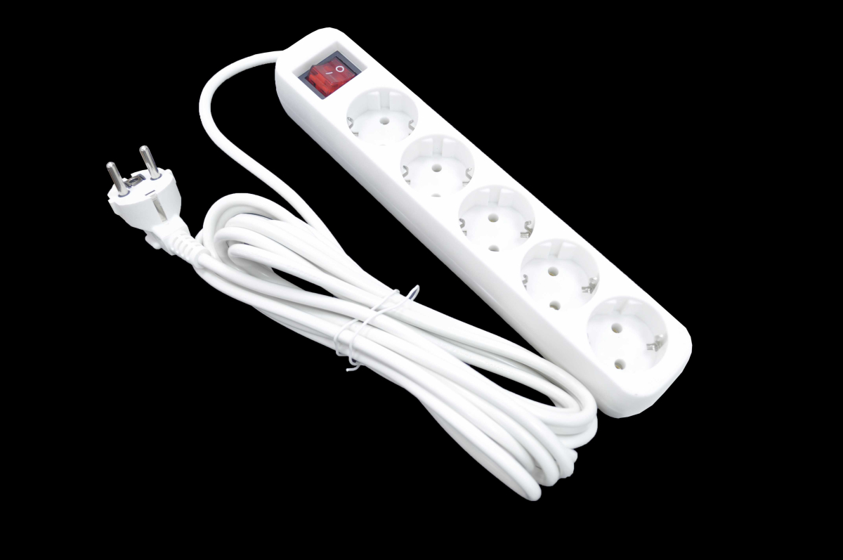 Сетевой удлинитель, 5 розеток евростандарт, с заземлением, корпус: из негорючего пластика. Суммарная мощность нагрузки 2.2 кВт. Максимальный ток нагрузки 10А. Длина кабеля 5 метров
