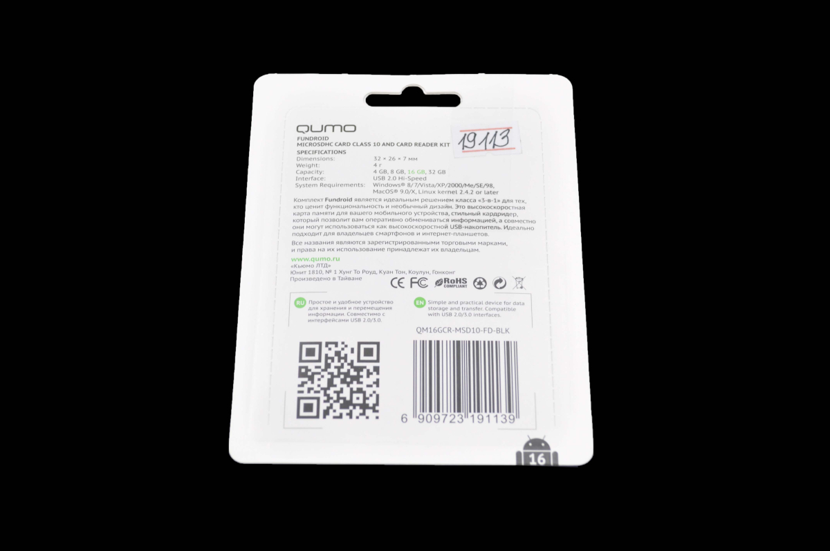 19113 Комплект Qumo для мобильных устройств MicroSD 16Gb Class10 + USB картридер Fundroid (черный)