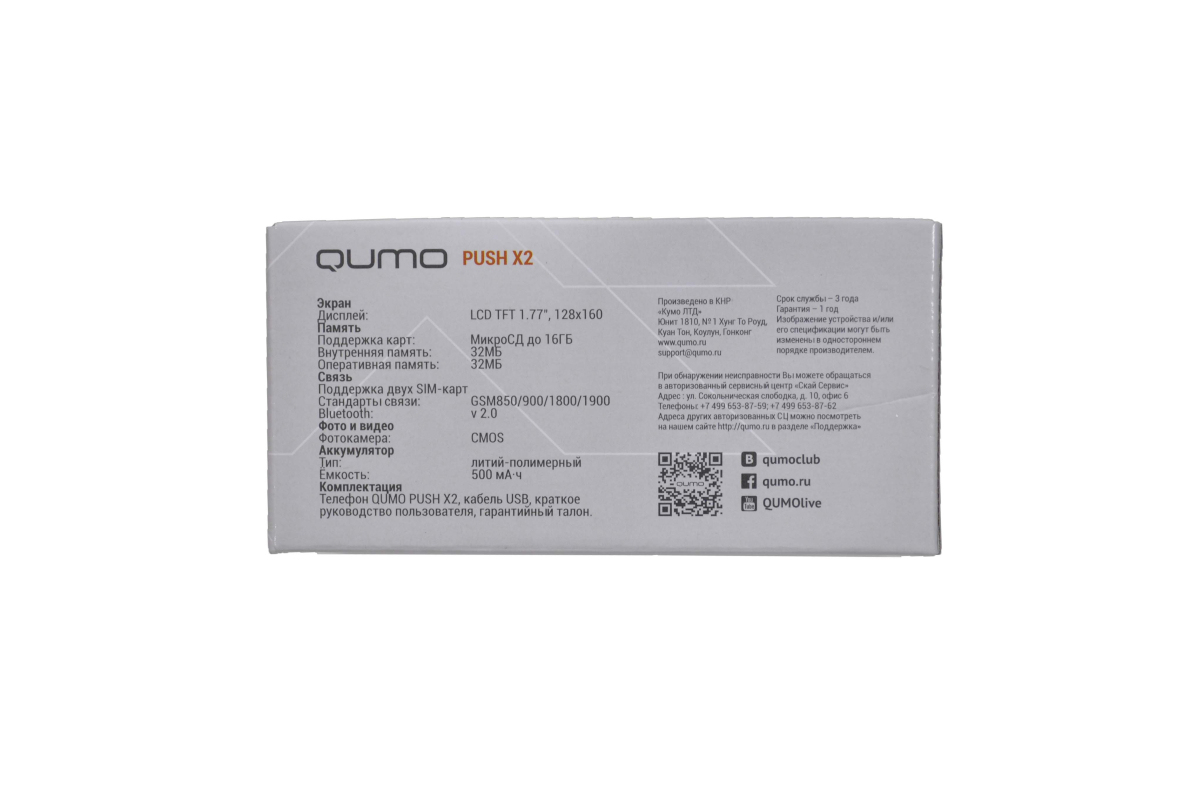 Телефон QUMO Push X2 - классический кнопочный телефон со всем необходимым функционалом. USB-соединение MicroUSB. Тип карт памяти MicroSD (до 16 ГБ). Тип экрана LCD 1.77". Разрешение экрана 128x160. Размер экрана 1.8". Стандарты сотовой связи GSM 850/900/1800/1900 MHz. Динамики. Емкость аккумулятора 500 мАч. Микрофон есть. Тип аккумулятора Li-poly. Объём оперативной памяти 32 МБ. Поддержка двух SIM-карт. FM-тюнер. Разъём для наушников 3.5 mm mini-jack. Камера CMOS. USB-кабель. Гарантийная карта