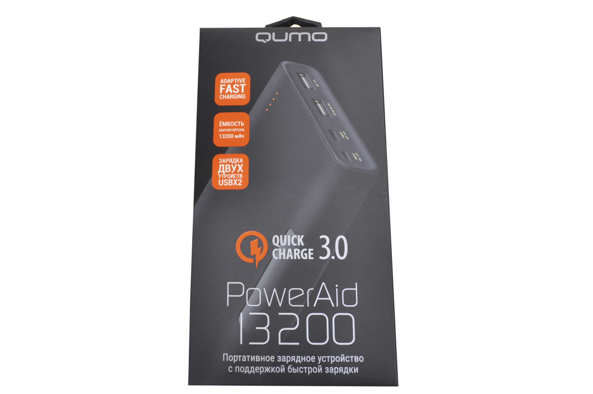 Внешний аккумулятор Power bank Qumo PowerAid QC 3.0. Общие характеристики емкость 13200 мА⋅ч. Одновременная зарядка двух устройств есть. Поддержка быстрой зарядки есть, Qualcomm Quick Charge 3.0. Вход. Разъем micro USB или USB Type-C. Ток 2 А. Выход: Разъемы USBx2. Максимальный ток на USB 1 2 А. Переходник на micro USB есть. Батарея Тип Li-Ion. Индикатор заряда есть. Материал корпуса пластик. Комплектация кабель USB - micro USB