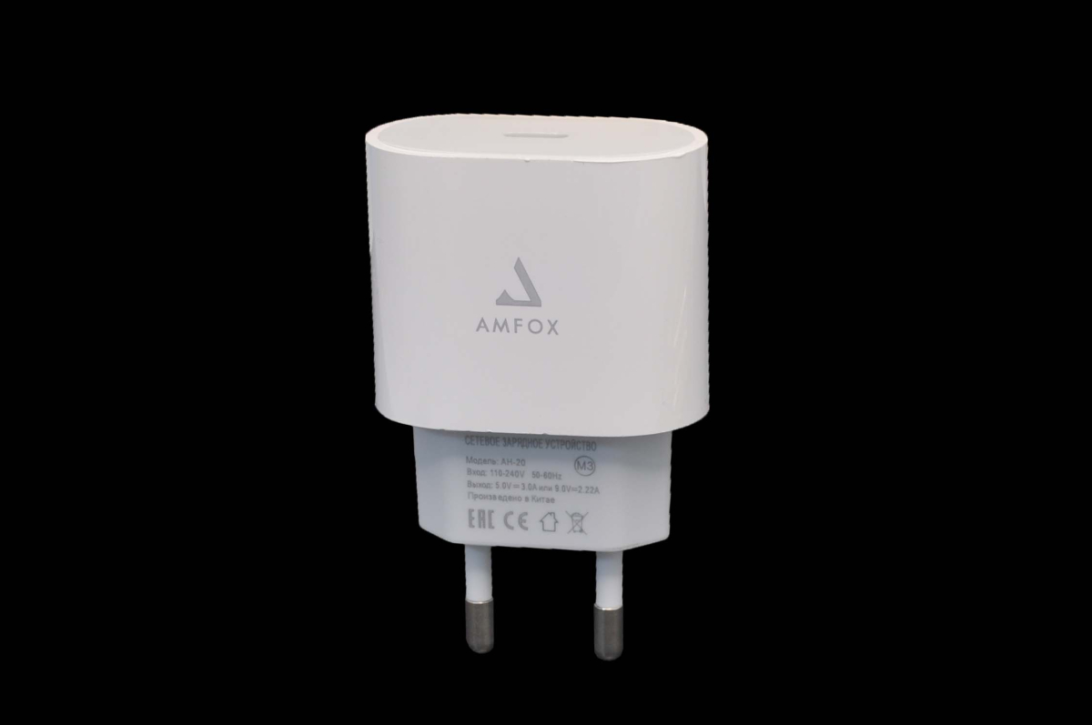 Сетевое зарядное устройство AMFOX AH-20. Разъем на блоке питания USB Type-C. Мощность 20Вт. Выход тока до 2А
