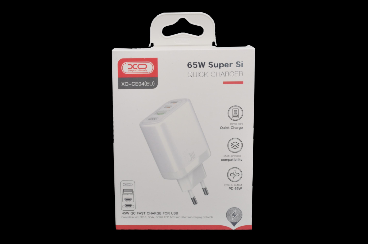 Сетевое зарядное устройство XO CE04, мощность 65Вт, Type-Cx2/USBx1, быстрая зарядка QC 3.0+PD, белый блок