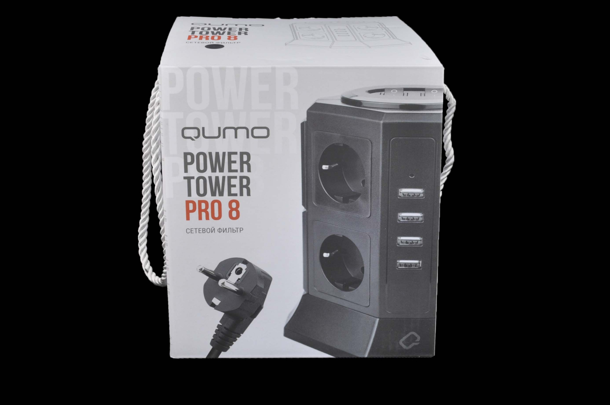Сетевой фильтр Qumo Power Tower Pro 8SP4U, 8 розеток, 2200 Вт, 10A, кабель 2м 3*1 мм чистая медь, пожаробезопасный пластик, евровилка, 4 USB порта 4.5A суммарно.