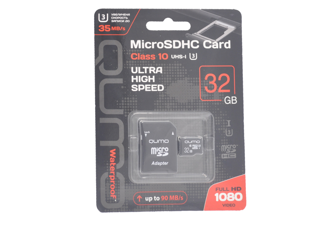 Карта памяти Qumo microSDHC, объем 32Gb, класс скорости: 10, адаптер. Скорость чтения до 90 МБ/с, скорость записи увеличена до 35 МБ/с.