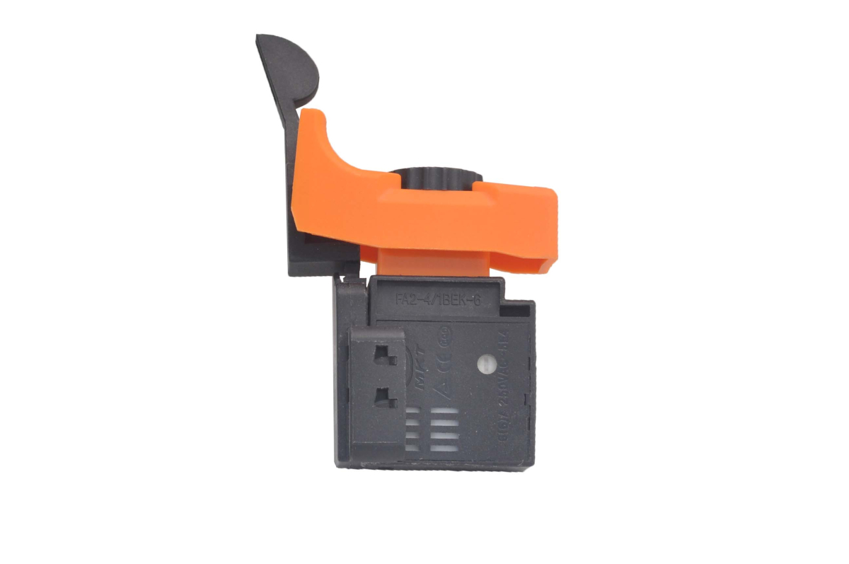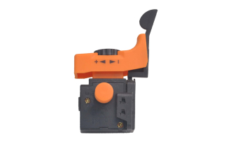 Выключатель (кнопка) для китайских дрелей DWT. Фиксатор для длительного включения и регулятор оборотов. Переключатель реверса загнут вверх. Крепление сетевых проводов - винтами, остальные - быстрозажимными фиксаторами. Максимальное напряжение - 250 В. Максимальный ток - 6 А.