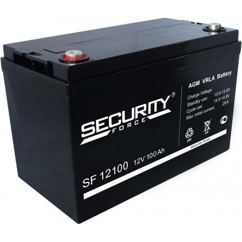 Аккумуляторная батарея SF12100 Security Force (12V 100A). Напряжение, В 12. Емкость, Ач 100. Длина, мм 330. Ширина, мм 173. Высота с клеммой, мм 220. Высота без клемм, мм 217. Технология AGM. Клеммы M6