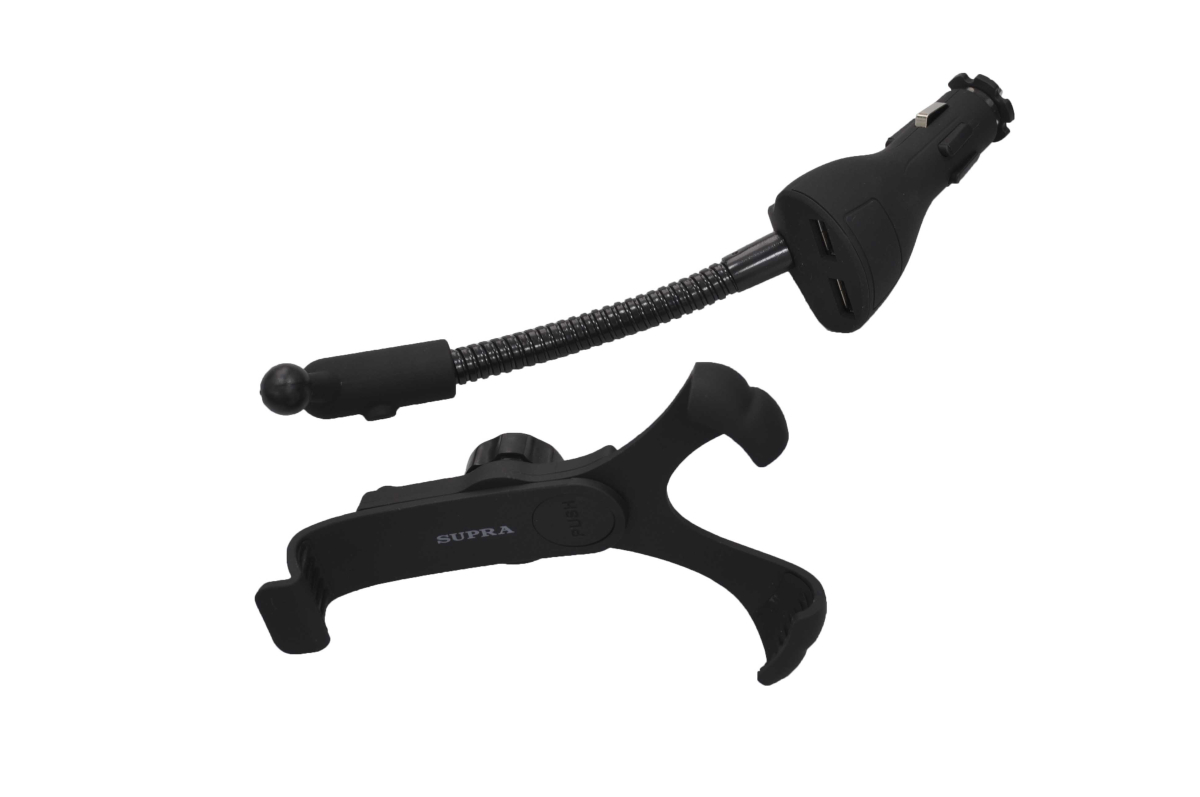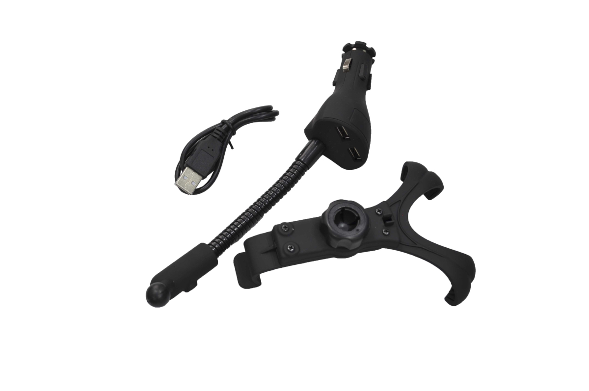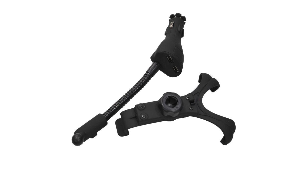 Автомобильный держатель для планшета/смартфона. Материал: высококачественный пластик, раздвижная часть держателя от 118 мм до 152 мм, штанга-удлинитель 19 см, возможность поворота устройства на 360 градусов, входное напряжение 12–24 В, выходной ток 5В, 2.1А. Совместим со смартфонами Apple, Samsung, Nokia, HTC, Sony и мобильными устройствами других производителей.