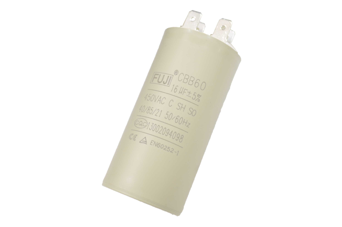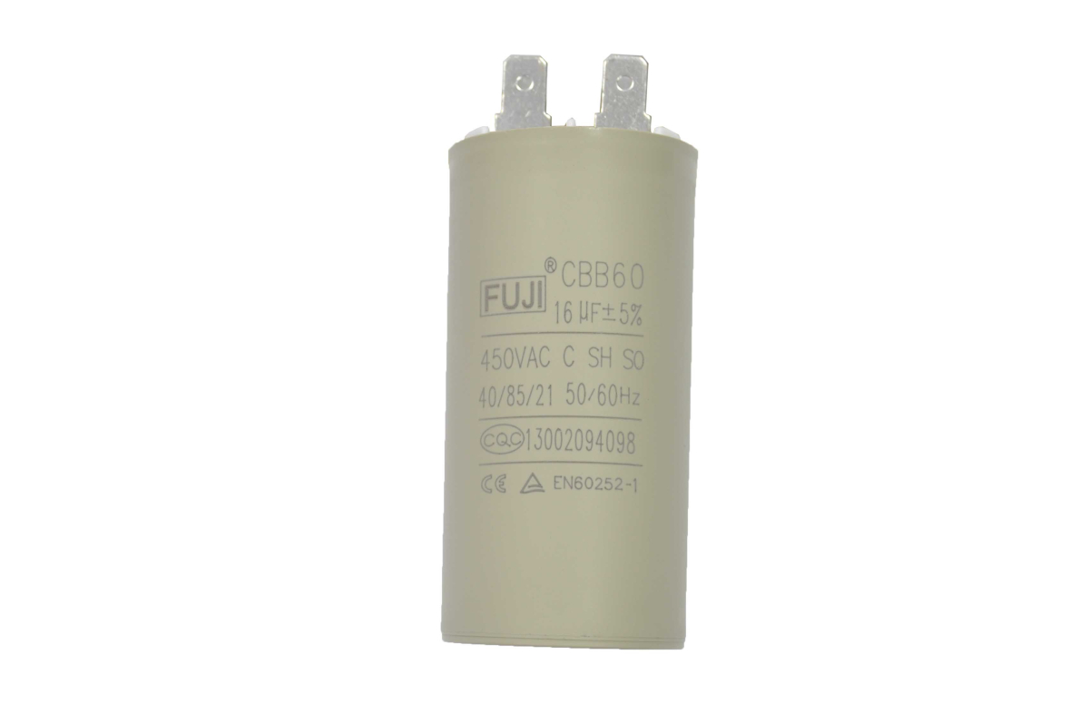 Конденсатор CBB60H пусковой постоянной ёмкости в герметизированном цилиндрическом корпусе. Номинальная емкость: 16 mkF, номинальное напряжение: 450V, допустимое отклонение ёмкости ±5%, диапазон рабочих температур -40°С…+85°С.