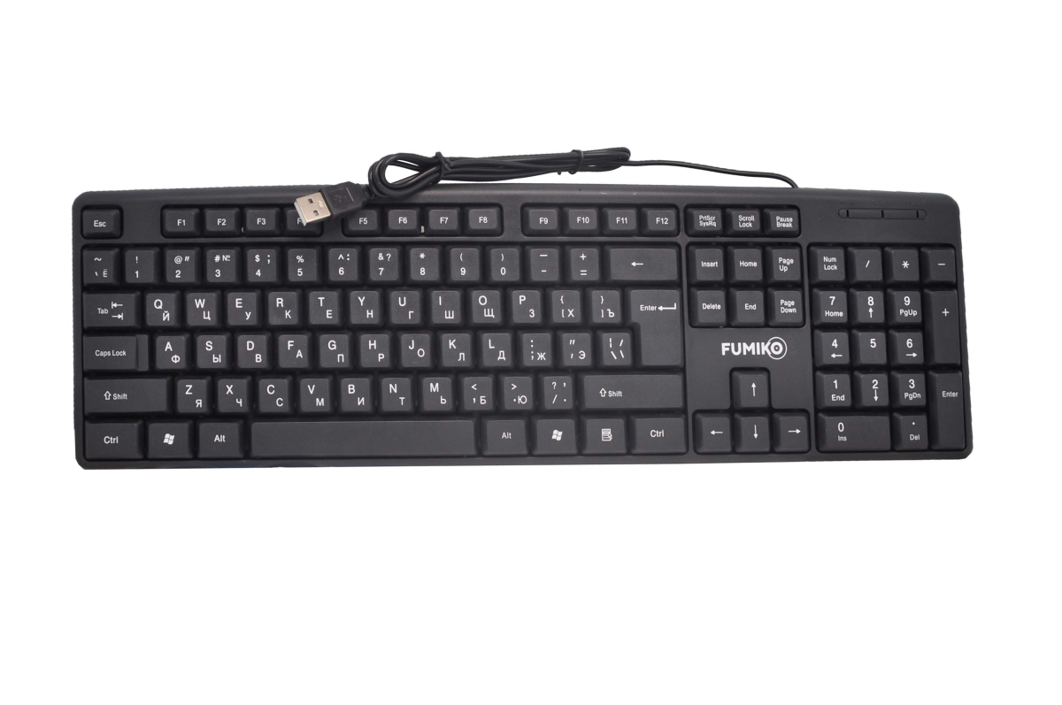 Компьютерная клавиатура FUMIKO CLASSIC, полноразмерная конструкция, состоит из 104 клавиш с мембранным механизмом нажатия.Тип клавиатуры: мембранная. Интерфейс: USB. Общее количество клавиш: 104 шт. Защита от влаги: IPX6. Длина кабеля: 1.5 м. Цвет: черный