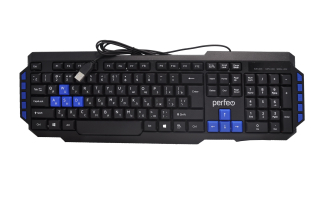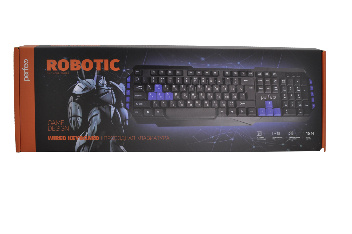 Клавиатура Perfeo ROBOTIC PF-5193 игровая, проводная. Беспроводное соединение: Нет. Бесшумные клавиши: Да. Длина провода, м: 1,5. Игровая: Да. Интерфейс: USB. Механизм клавиш: Мембранная. Подсветка: Нет. Подставка для рук: Нет. Программируемые кнопки: Нет. Цвет: Чёрный