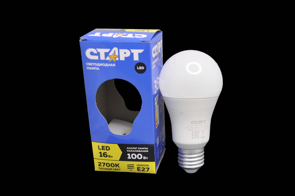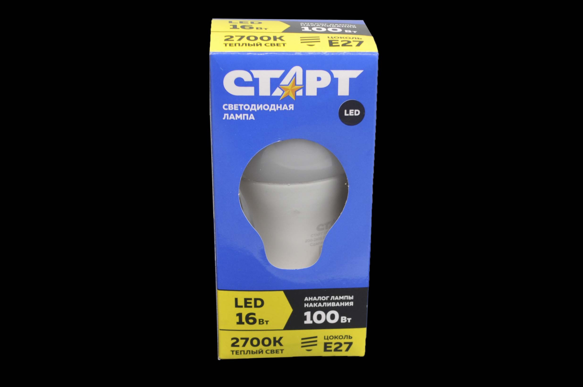 Светодиодная лампа СТАРТ LEDGLSE27. Мощность (Вт) 16. Напряжение 220 В. Цоколь E27. Цветовая температура 3000 К. Цветопередача 80 Ra. Вид FR/матированная. Форма груша. Световой поток 1280 Лм. Срок службы 30000 ч. Эквивалент лампы накаливания 100 Вт