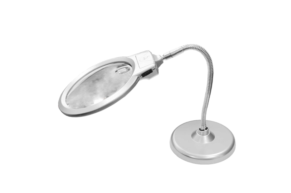 Лупа на подставке с двумя видами линз: основная линза 2Х, дополнительная линза 5Х. Диаметр основной линзы: 130mm. Диаметр дополнительной линзы: 24mm. Конструкция: гибкий держатель позволяет установить лупу в любое необходимое положение и высоту. Светодиодная лампа LED. Легкая замена батареи.