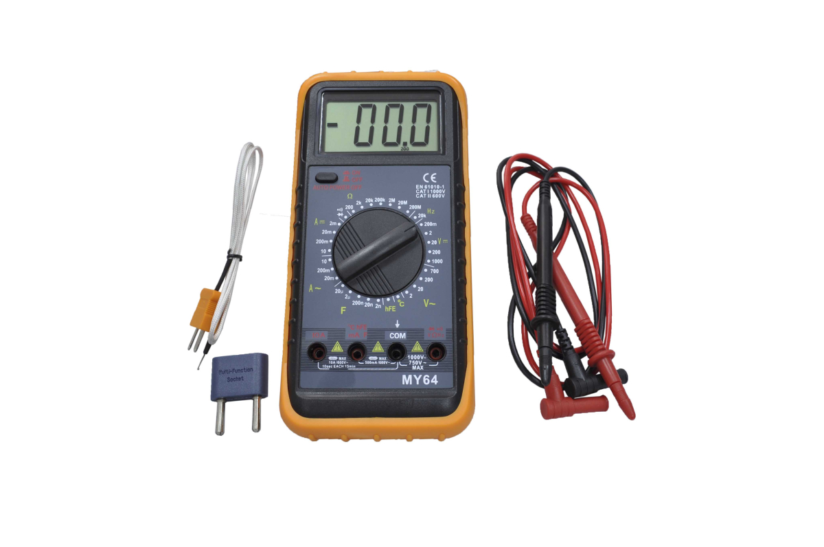 Цифровой мультиметр MY-64. Характеристики: Количество измерений в секунду: 2-3. Разрядность: 3 ½. Постоянное напряжение U=: 0,1мВ-1000В. Переменное напряжение U~: 1 мВ-700 В. Переменный ток I~: 10 мкА-10 А. Постоянный ток I= 1 мкА-10 А. Диапазон частот по переменному току: 40-400Гц. Сопротивление R: 0,1 Ом - 200 МОм. Входное сопротивление R: 10 МОм. Температура t°C (термопара типа К): -20° ÷ +1000°. Ёмкость C: 1 пФ - 20 мкФ, Частота F: 10Гц-20кГц. Коэффициент усиления Транзисторов h21э: до 1000. Режим «прозвонка»: <50 Ом. Диод-тест: есть. Питание: 9В (типа NEDA 1694, Крона ВЦ). Габариты, мм: 91 × 189 × 31,5. Вес, грамм (с батареей): 310. Индикация разряда батарейки. Индикация перегрузки «0L». Автовыключение ~40мин