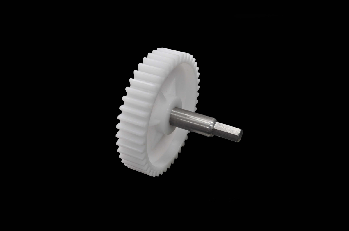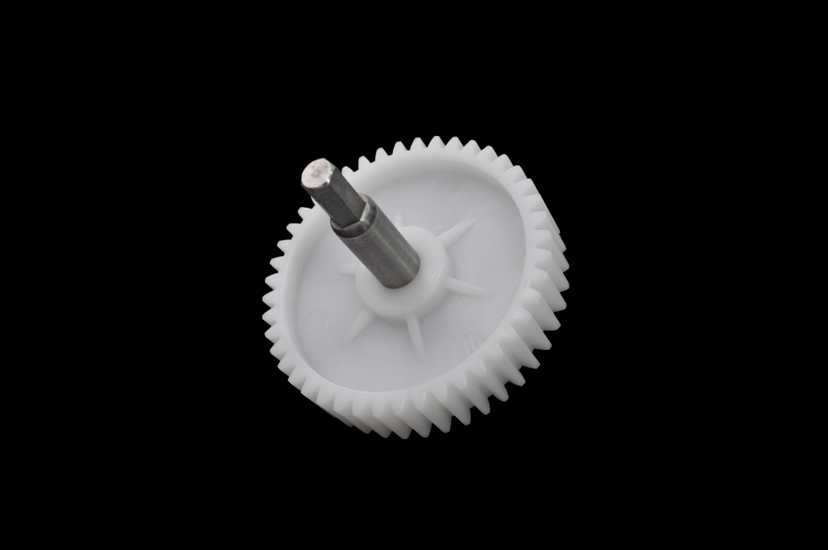 Шестерня большая с металлическим валом электромясорубки Polaris (Поларис) PMG 2005, PMG 1605, PMG 1804, PMG 1805 (диаметр 80 мм, высота 17 мм, длина вала 74 мм, диаметр вала 12 мм, шестигранник 8 мм, прямые зубья 44 шт.)