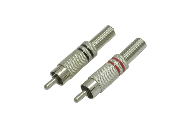 Разъем RCA (штекер) Металл под пайку черный/красный для соединения кабелей с видео и аудиоаппаратурой. Установка провода в разъеме производится с помощью пайки (центральная жила - пайка, а оплетка - обжимается). Разъём оснащен специальным металлическим никелированным пружинным амортизатором кабеля, который позволяет кабелю гнуться только с безопасным радиусом изгиба. Для передачи стереозвука используется два тюльпана с черной и красной цветовой меткой, что позволяет идентифицировать левый или правый канал.