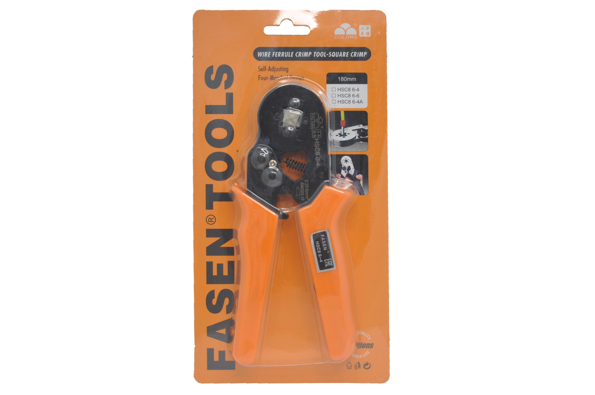Кримпер для обжима кабельных наконечников FASEN HSC8 6-4 - универсальный электромонтажный ручной инструмент для соединения проводов между собой или с контактами разъёмов, с наконечниками или оконцевателями при электромонтажных работах без применения пайки или сварки. Тип клемм (наконечников) для обжатия изолированные/ неизолированные (трубчатые) втулочные наконечники. Сечение провода 0,25-6 мм² (23-7 AWG). Особенности профиль обжима - квадрат