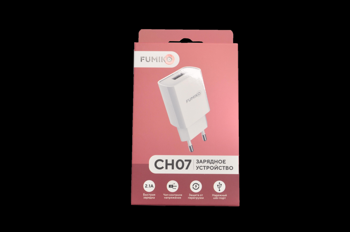 Сетевое зарядное устройство FUMIKO CH07 1USB. Интерфейс подключения: USB. Питание: от сети 220В. Количество USB: 1 шт. Входной ток: АС 100-240В. Выходной ток max: 5В, 2.1А