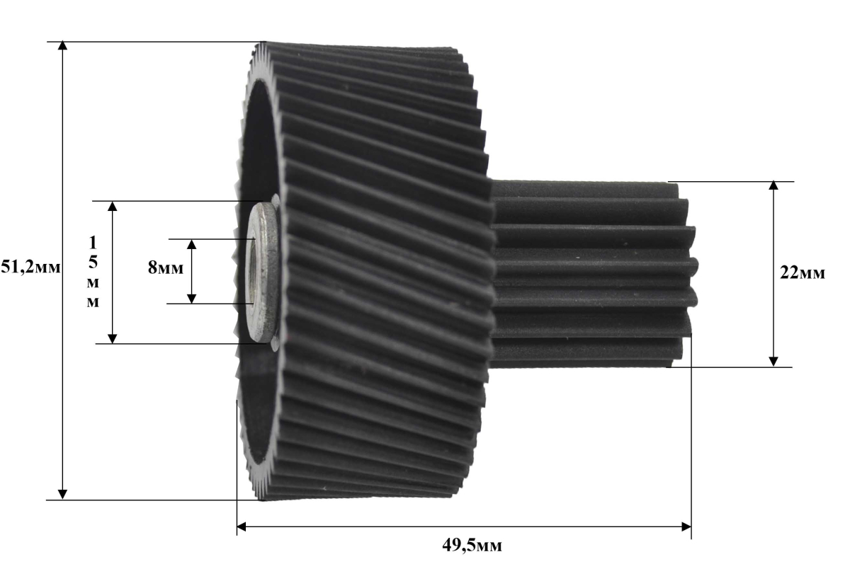 Шестеренка для мясорубок VITEK, Panasonic, Dex, с метал. Вставкой, зубья 53/16 косой/прямой, диам. большой 51,2мм, высота 49,5мм, диам. малый - 22мм, диам. метал. вставки внутр. 8мм, диам. метал. вставки 15мм