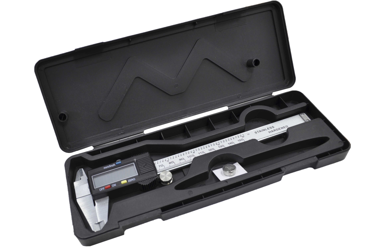 Штангенциркуль электронный. Высокий показатели точности. Наличие глубиномера. Все элементы устройства изготовлены из высококачественных материалов. Поддержка нескольких единиц измерения (мм/inch). Питание батарея типа LR44 - 1 шт (в комплекте). Удобное хранение и транспортировка в закрывающемся футляре. Легкость считывания показаний - данные выводятся на жидкокристаллический дисплей. Функция обнуления максимально упрощает проведение относительных измерений и установку нуля.Состоит из подвижного механизма и штанги. Зажимной винт позволяет надежно зафиксировать исследуемый предмет для достижения максимально точных результатов. Пределы измерения: 0-150 мм (0-6"). Крайне низкий шаг измерений: 0,01 мм (0,005"). Минимальные показатели погрешности измерений: ±0,03 мм (±0,001"). Температура рабочего пространства в процессе измерения: (5-40) градусов. Относительная влажность воздуха: не более 80% при температуре 20 градусов.