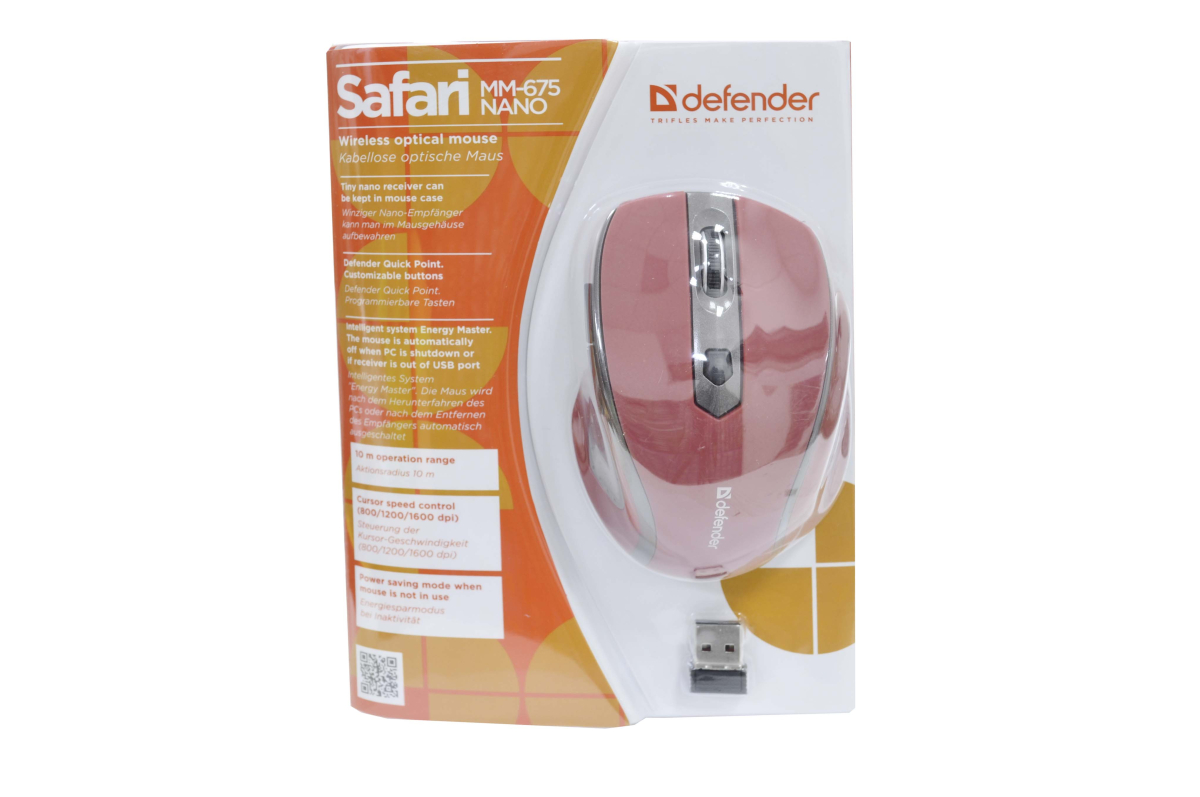 Мышь компьютерная беспроводная Defender Safari MM-675.Тип беспроводной связи радиоканал. Радиус действия беспроводной связи 10 м. Интерфейс подключения USB. Цвет красный. Мышь. Принцип работы оптическая светодиодная. Беспроводная связь есть. Дизайн для правой руки. Колесо прокрутки есть. Количество клавиш 5. Разрешение оптического сенсора 1600 dpi. Источник питания мыши 1xAA