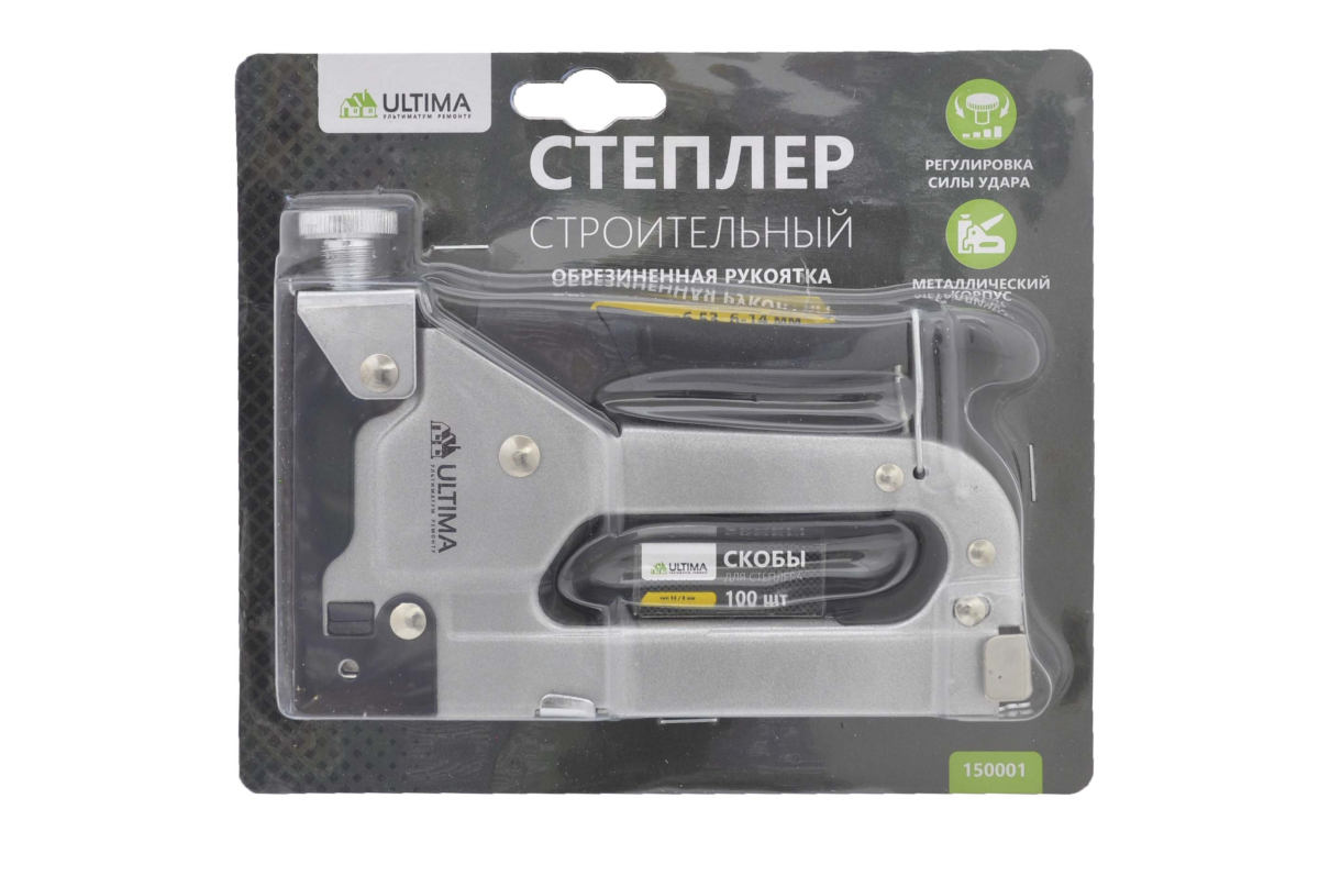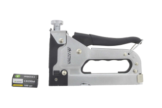 Строительный степлер для скоб Ultima, Тип 53 (6-14 мм). Степлер предназначен для быстрого крепления листового материала (оргалита, фанеры, ДСП, ДВП, пленки, утеплителя) к деревянному основанию. Изготовлен из стали методом штамповки и имеет обрезиненную рукоятку. Есть плавная регулировка силы удара, для контроля глубины забивания скобы.