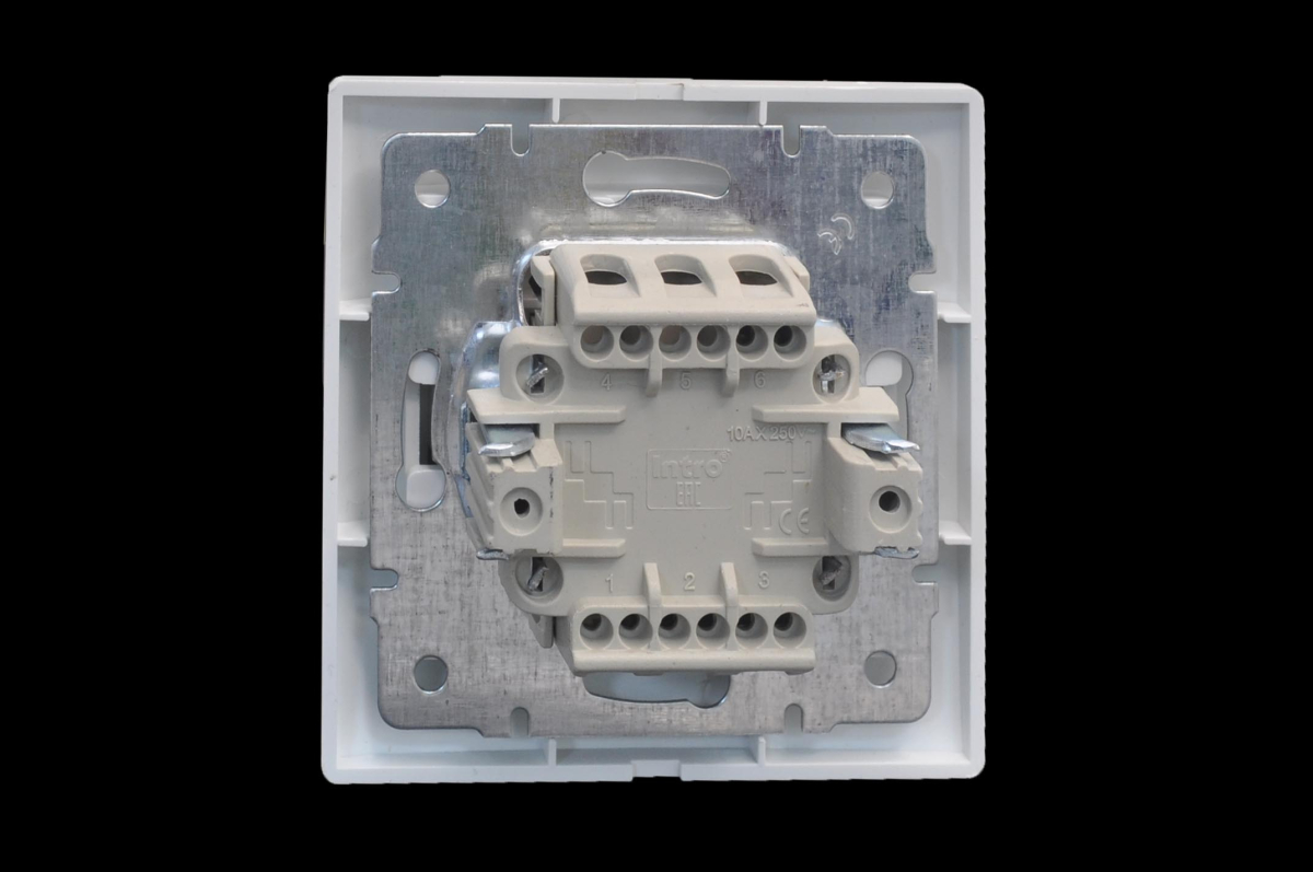 Проходной выключатель (переключатель) 1-клавишный серии Intro Plano скрытой установки цвет белый. Номинальные характеристики 10А 250В. Выключатель из качественного негорючего термопласта, укомплектован одноместной рамкой, оснащён винтовыми клеммами.