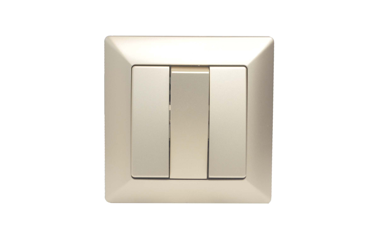 Выключатель тройной, 10А-250В, IP20, скрытой установки, цвет шампань Intro Plano. Высота 104. Глубина, мм 33. Ширина, мм 65. Номинальное напряжение бытовой сети, В 250В. Номинальный ток, А 10. Подсветка нет. Сечение провода 1,5 мм^2 (макс. 4 мм^2)