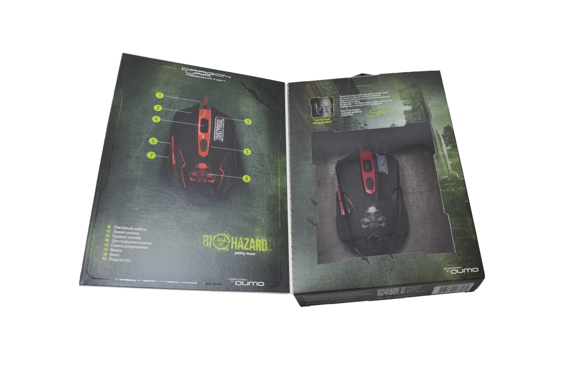 Мышь Qumo Dragon War Biohazard компьютерная игровая, 6 кнопок, интерфейс подключения к ПК: проводной, размеры (ШхВхГ):73х38х124 мм, гарантийная карта, подсветка