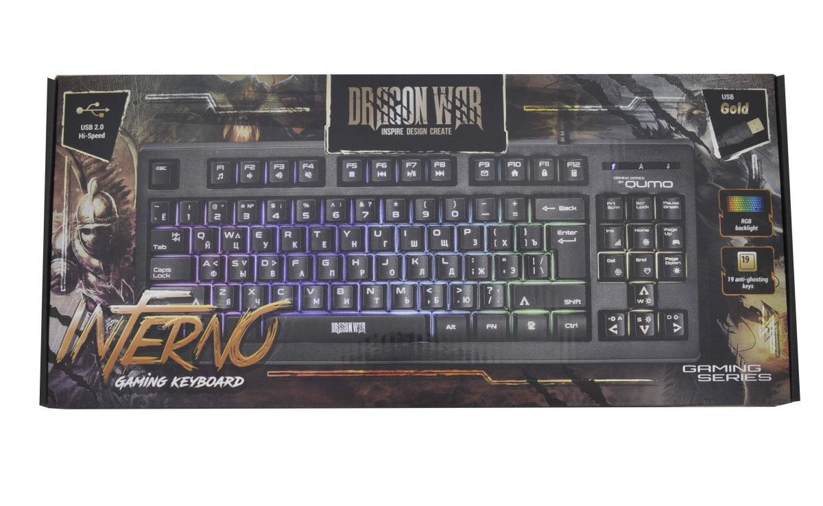 Игровая проводная клавиатура Qumo Inferno. Длина кабеля 1,75 м. Материал корпуса пластик + металл. Дополнительно 19 Anti Ghosting клавиш. Интерфейс USB 2.0. Кол-во клавиш 87. Подсветка клавиш подсветка русских символов, RGB, встроенные эффекты. Размер 372*151*37 мм. Цифровой блок нет. Тип Игровая мембранная клавиатура. Вес 605±5 г.