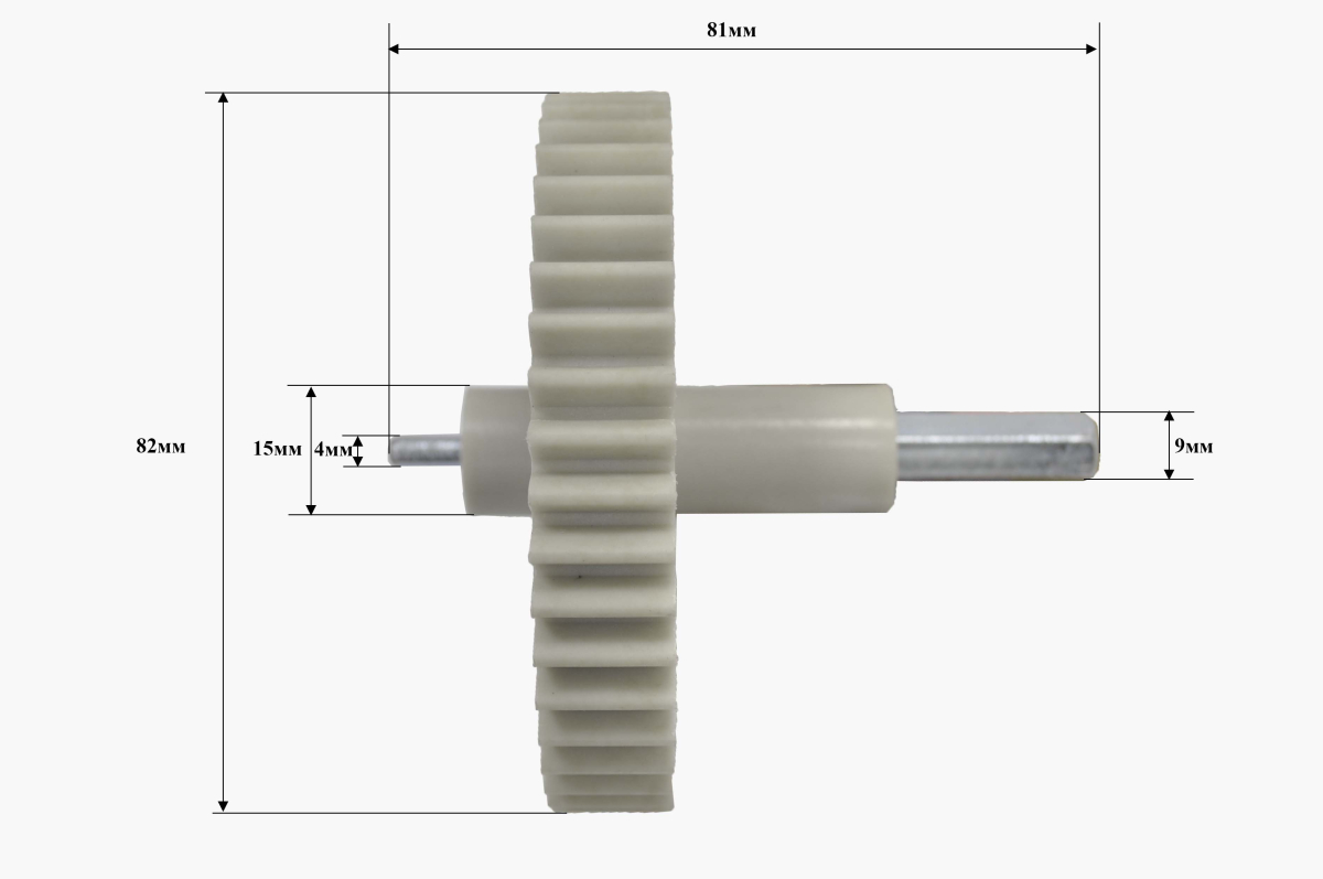 Шестерня для мясорубки с металлическим валом, диам. 82мм, высота 81мм, диам. малого пластика - 15мм, малого штока - 4мм, бол. штока - 9мм