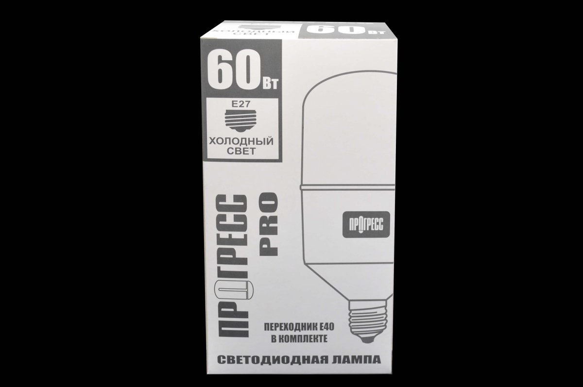 Лампа светодиодная Прогресс серии "Про". Мощность, Вт 60. Напряжение, В 180-250. Цоколь Е27 (Переходник Е40). Светоотдача, Лм 5000. Угол рассеивания, о 270. Цветовая температура, К 6500 / Холодный свет. Класс энергоэффективности А