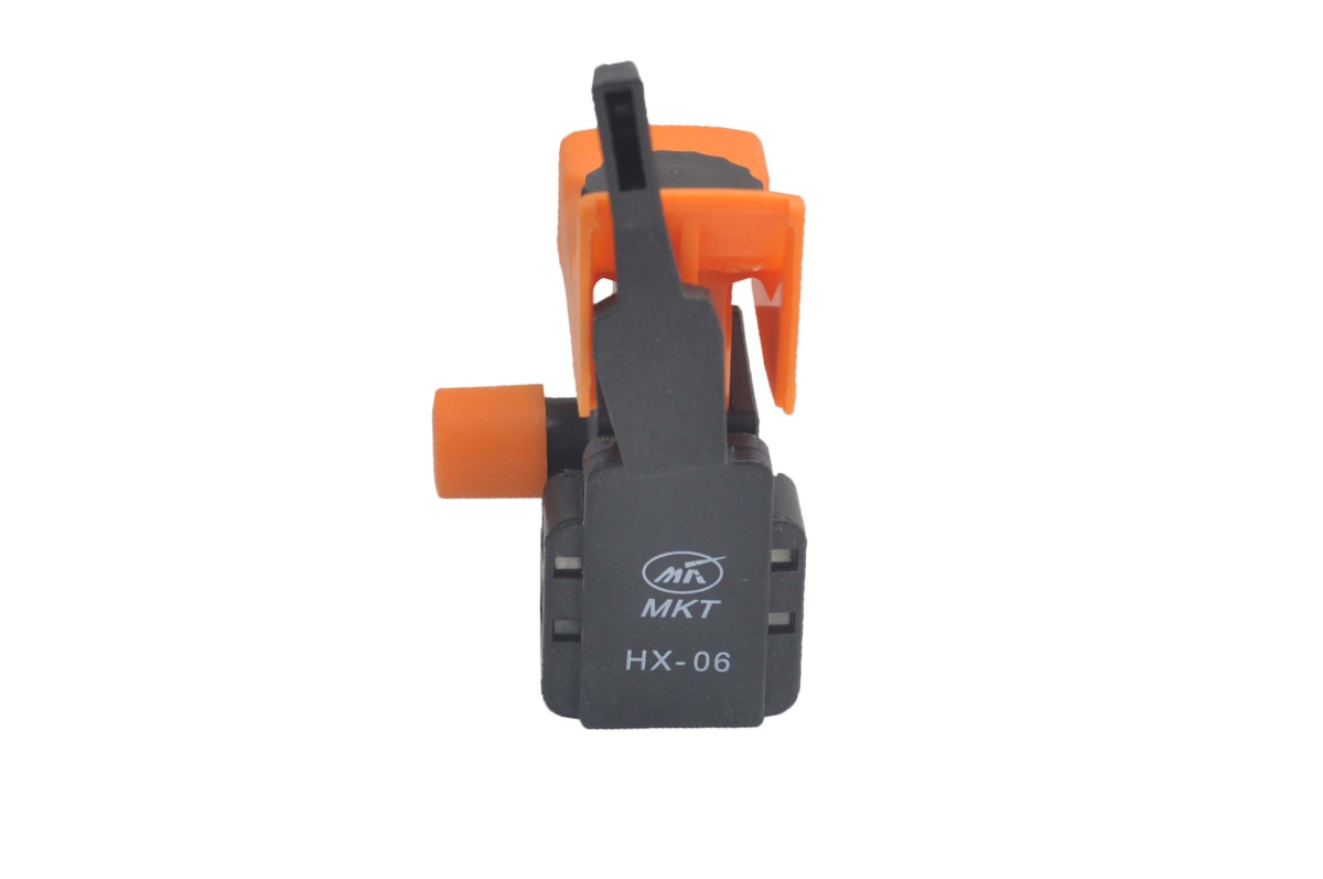 Выключатель (кнопка) для китайских дрелей DWT. Фиксатор для длительного включения и регулятор оборотов. Переключатель реверса загнут вверх. Крепление сетевых проводов - винтами, остальные - быстрозажимными фиксаторами. Максимальное напряжение - 250 В. Максимальный ток - 6 А.
