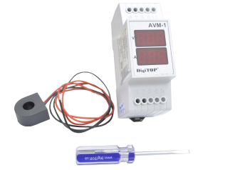 Амперметр-вольтметр переменного тока DigiTOP АVМ-1 предназначен для отображения действующего значения тока и напряжения в однофазной сети переменного тока на светодиодных индикаторах . Измерение тока производится посредством внешнего трансформатора тока (поставляется с прибором). Диапазон измерения тока : 1-63А. Диапазон измеряемых напряжений : ~40В...~400В, 50(±1)Гц. Напряжение питания : ~220В (± 10%), 50Гц. Погрешность измерения : не более 1%. Диапазон рабочих температур : +5…+50 °C. Потребляемая мощность : не более 5Вт. Степень защиты прибора : IP20. Габаритные размеры : 90x35x64 мм