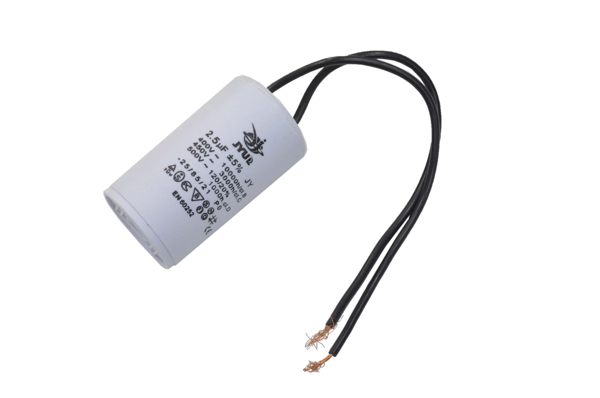 Конденсатор CBB60 с гибкими выводами постоянной ёмкости в герметизированном пластиковом корпусе. Номинальная емкость: 2,5mkF, ном. напряжение: 450V, допустимое отклонение ёмкости ±5%, размер: 30х55 мм