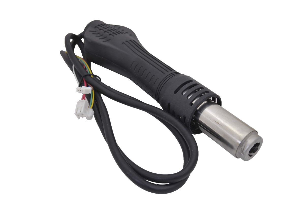 Фен к паяльной станции Помощник ПС-93. Два красных - питание 220В (Переменный). Зелёный(+) / желтый (-) - фен. Коричневый/черный - магнитный датчик включения(геркон). Синий/черный - датчик температуры. Белый - общий минус. Длина кабеля 1м. Длина фена 23см