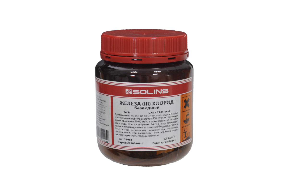 Железа (III) хлорид гексагидрат (CAS 10025-77-1) FeCl3* 6H2O. Применяется при травлении печатных плат (радиоэлектроника, электротехника). Используется для травления печатных форм (офорт, цинкография), как альтернатива азотной кислоте, реакция с которой сопровождается выделением высокотоксичных паров («лисий хвост»). Применяется как протрава при крашении тканей. Растворите содержимое банки (250г) в 500-750 мл воды. Время травления 40-60 мин, в зависимости от толщины слоя меди. Для обеспечения оптимальных условий протекания реакции раствор должен иметь температуру порядка 30-400С и постоянно перемешиваться
