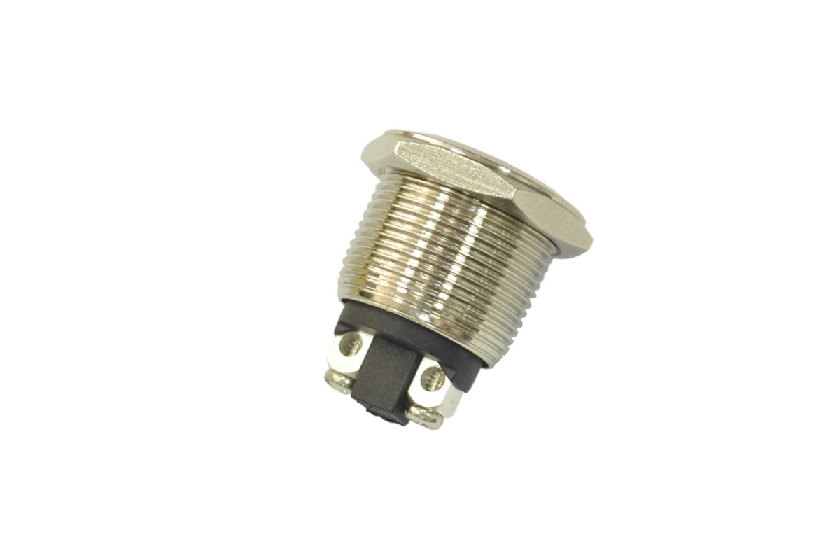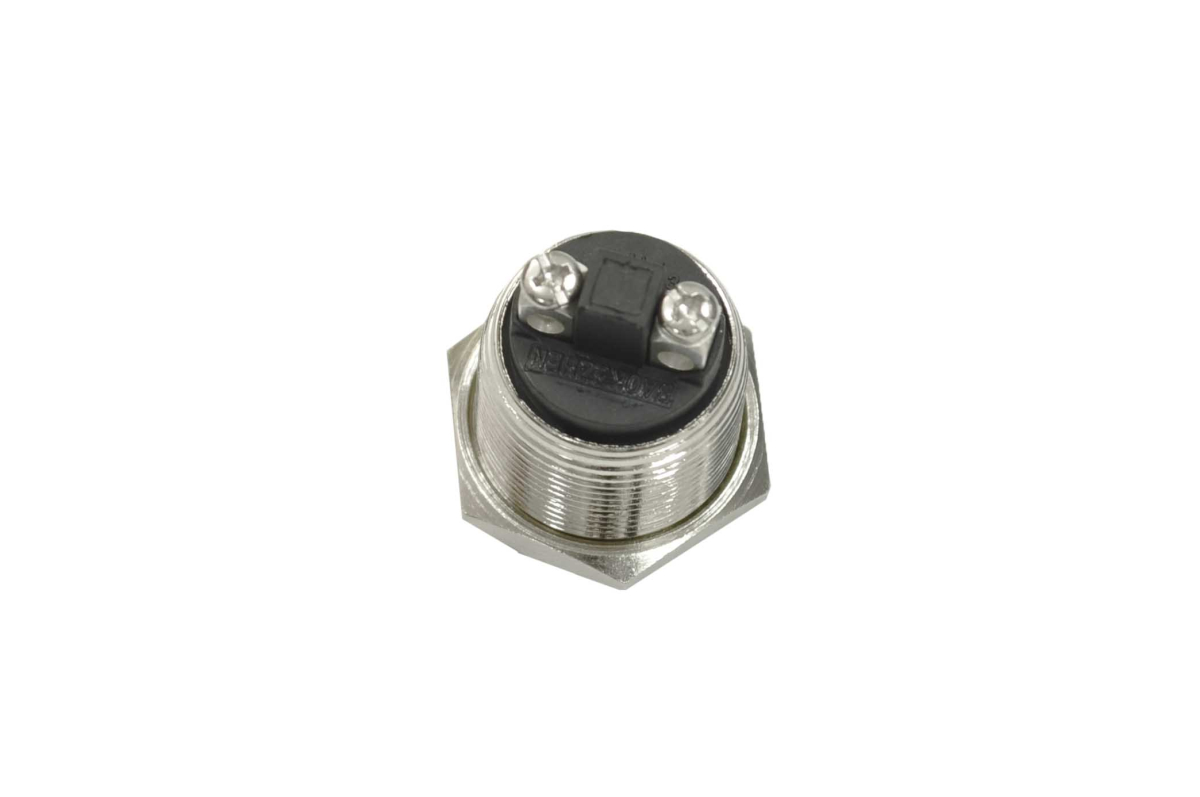 Кнопка антивандальная Ø19 Б/Фикс (2с) (ON)-OFF плоская для коммутации электрических цепей переменного тока напряжением до 250В путем включения-выключения питающего провода. Такие кнопки применяются в местах, где существует большой риск их повреждения (на различных производственных линиях, в лифтовых кабинах, около входной двери и т.д.). Главными отличительными особенностями антивандальной кнопки являются металлическое исполнение и неуязвимость контактной группы, что обеспечит ей долговечное функционирование. Изделие состоит из двух основных частей - лицевой части (головки) и контактной, и имеет пружинный возвратный механизм. Монтаж осуществляется без применения винтов на плоских панелях толщиной от 0.5мм до 10мм. Подключение проводов осуществляется с помощью пайки или клемм. Основные характеристики: Номинальное напряжение: 250В; Номинальный ток: 3A (250VAC); Тип переключения: (ON)-OFF; Количество контактных групп: 1; Количество контактов в контактной группе: 2; Фиксация положений: отсутствует; Индикатор коммутационных положений: отсутствует; Установочный диаметр: 19мм; Рабочая температура: от -25℃ до +85℃; Ресурс: 10 000 циклов.