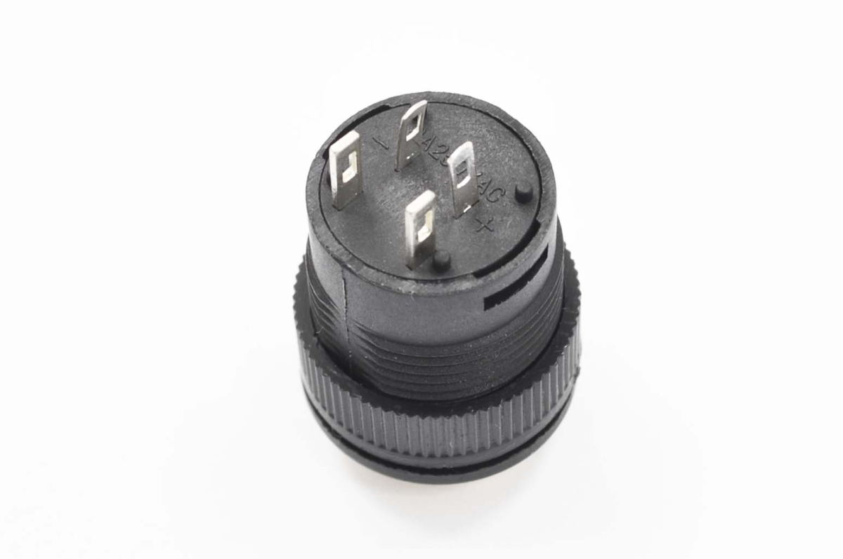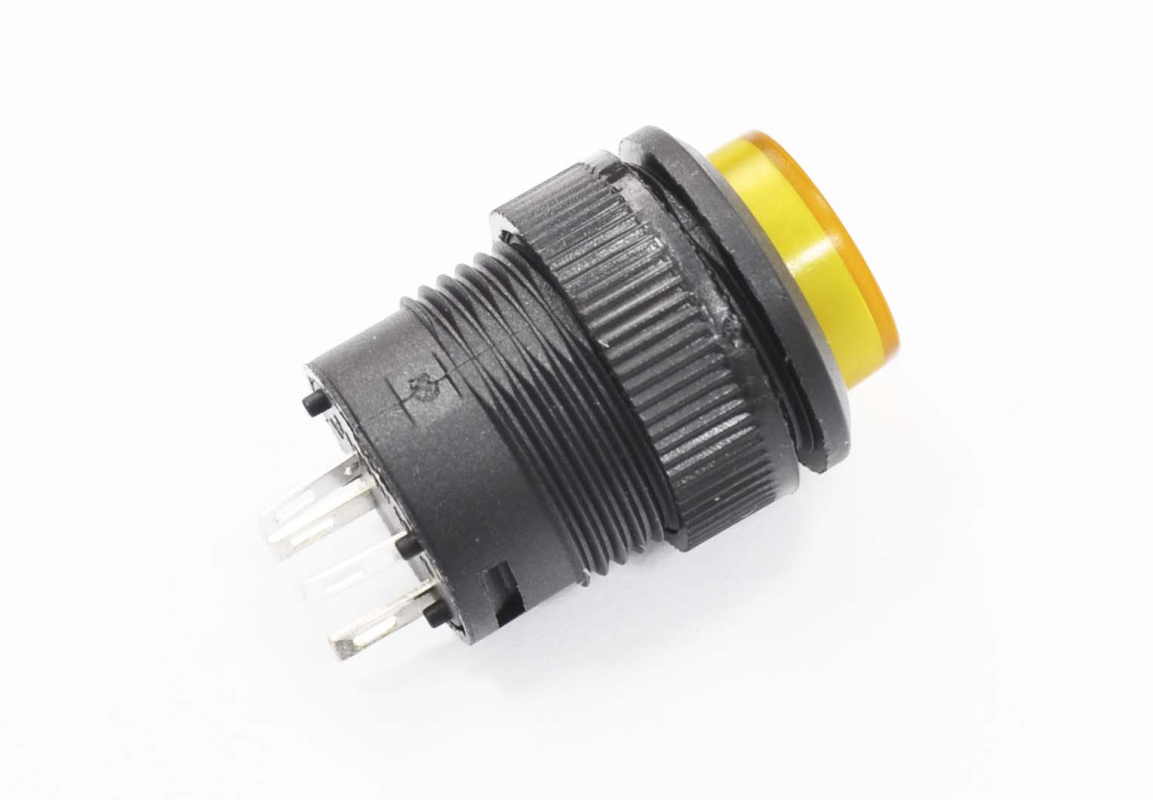 Переключатель кнопочный серии R16-503.- круглый для крепления на панель. Технические параметры: Подсветка: есть. Фиксация : нет. Исполнение: нормально разомкнутый. Рабочее напряжение,В: 250. Предельный ток: 3 A при 250VAС. Алгоритм работы: OFF-(ON). Цвет корпуса:черный. Цвет кнопки: желтый. Контактов: 4. Крепление: гайкой. Габариты(диаметр,высота),мм: 18х18