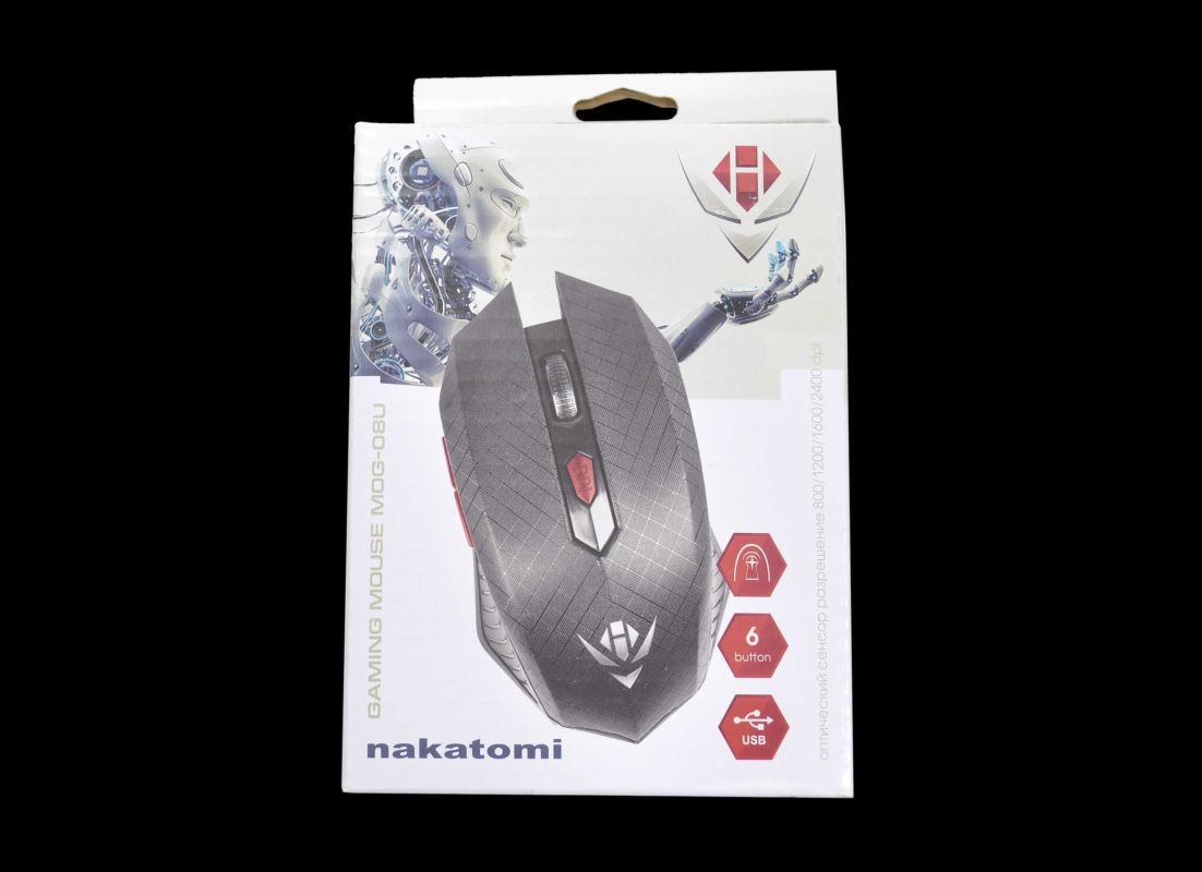 Оптическая проводная мышь Nakatomi MOG-08U. 6 кнопок. Колесо прокрутки. Разрешение 800/1200/1600/2400 dpi, изменяется динамически кнопкой "dpi". Интерфейс USB. Размеры 120*68*36 мм (В*Ш*Г). Вес 82 г. Кабель в текстильной оплетке, 1.5 м