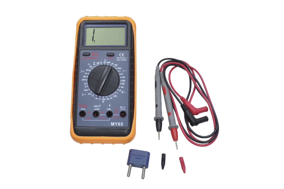 Универсальный цифровой мультиметр MY65, с большим входным сопротивлением, имеет дополнительные функции: Data Hold, измерение температуры,тока, напряжения, сопротивления, частоты и емкости, тест диодов и транзисторов, прозвон цепей. Мультиметр MY65 имеет съёмный защитный кожух – подставку. Основные параметры мультиметра: LCD Дисплей 19999 единиц. Удержание показаний Data Hold. Входное сопротивление 10МΩ. Тестирование диодов. Прозвонка цепи 60Ω. Защита от перегрузок. Автоотключенние