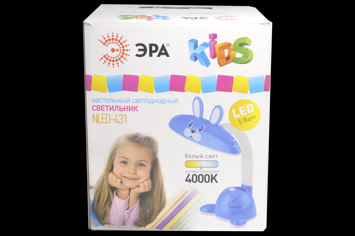 Эра NLED-431-5W-BU - настольный светильник для детей в виде забавного зайца. Гарантия 1 год. Количество светодиодов, шт 8. Максимальная мощность 5W Материал металл, пластик. Расположение выключателя на основании. Тип крепления/установки Основание.Тип цоколя LED. Условия хранения соблюдение мер предосторожности от механических повреждений и воздействия атмосферных осадков. Функциональные преимущества Светильник со светодиодами (LED) в качестве источников света. Теплый белый свет - цветовая температура 4000К. Удобная подставка на основании поможет всегда иметь ручку, карандаши или линейку под рукой. Выключатель на основании. Детский дизайн в виде зайчика. Гибкая стойка - наклон и поворот плафона. Цвет синий. Цветовая температура 4000К