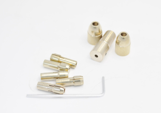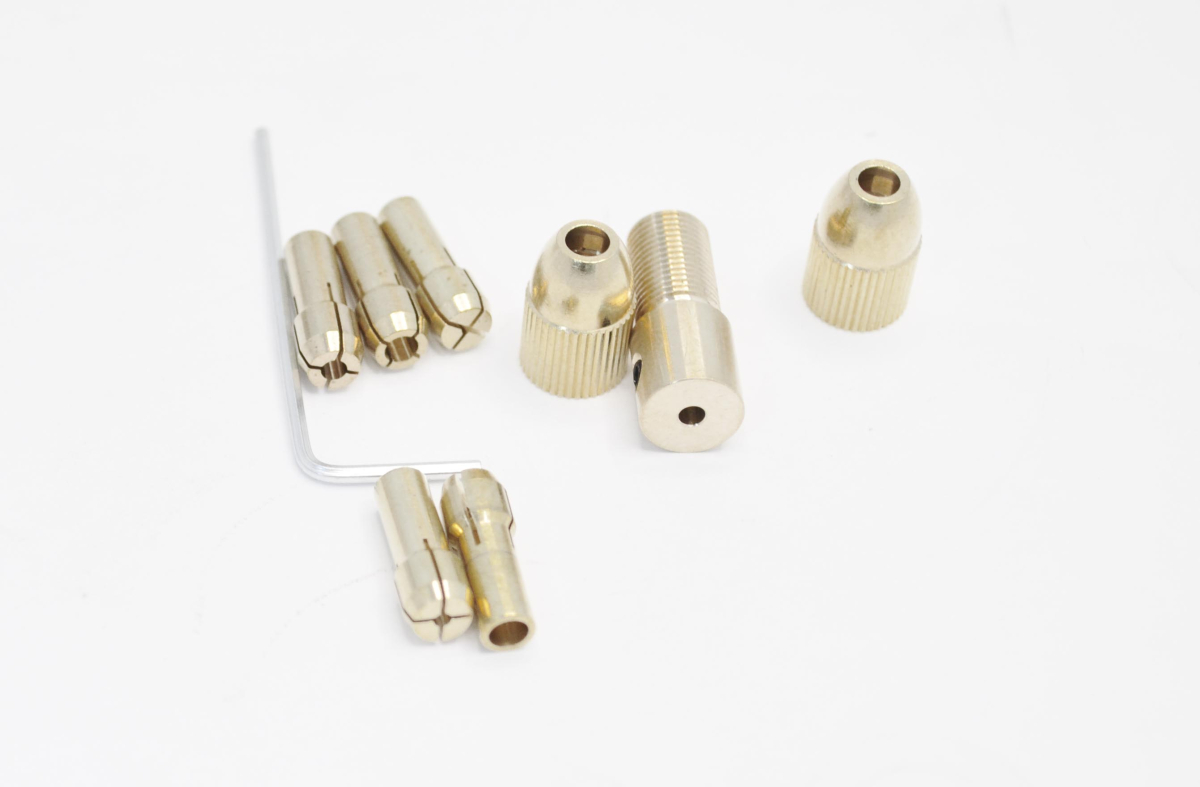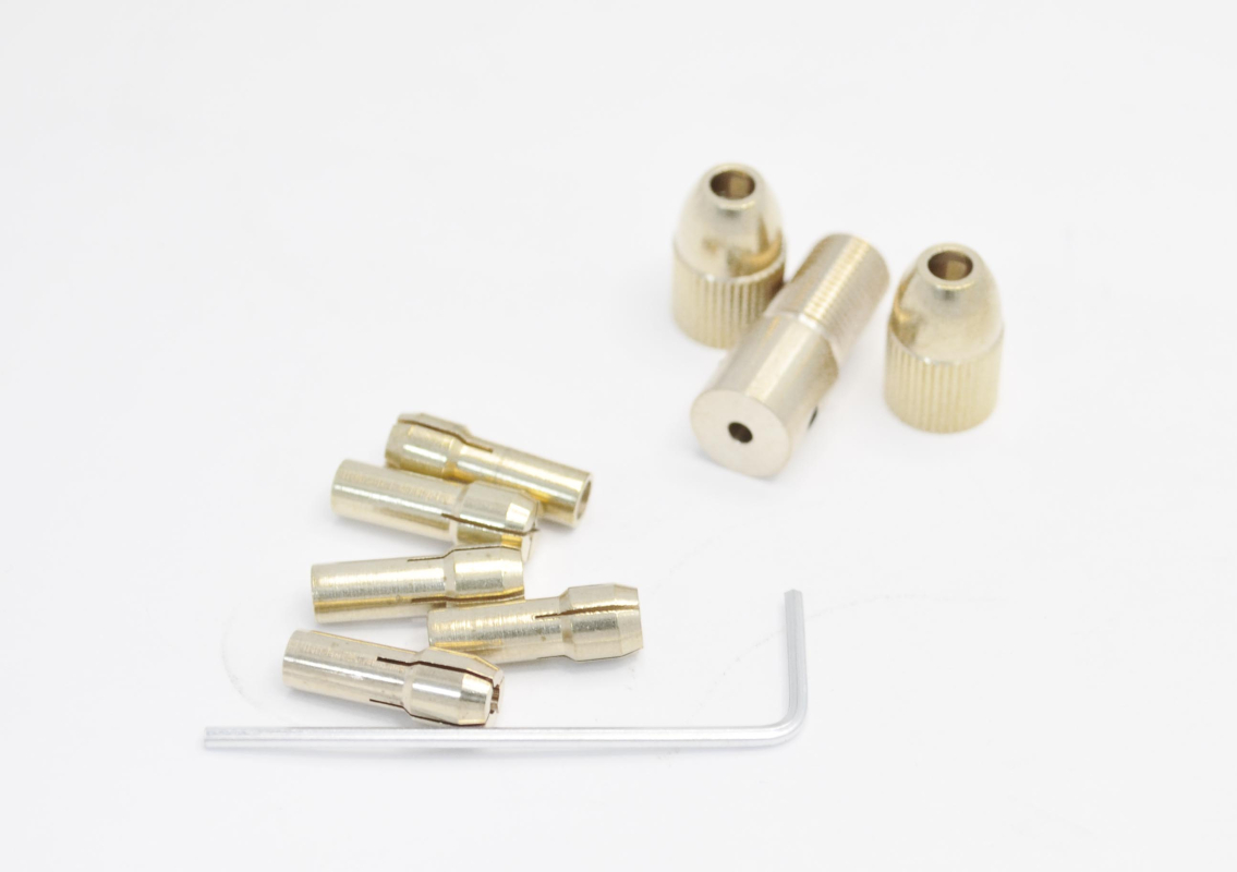Цанговый патрон на 2,35мм вал электродвигателя, гравера, мини-патрон для зажима от 0.5 мм-3.0 мм. В комплекте 5 шт. медных цанг + ключ для зажима на вал. Размер вала 2,35 мм, (доступны другие размеры 2 мм, 3,17 мм, 4,05 мм, 5,05 мм). Размер медного цангового патрона:0,5 мм, 1,0 мм, 1,5 мм, 2,0 мм, 3,0 мм/3,2 мм, что позволяет использовать для сверл 0,5~3,0 мм