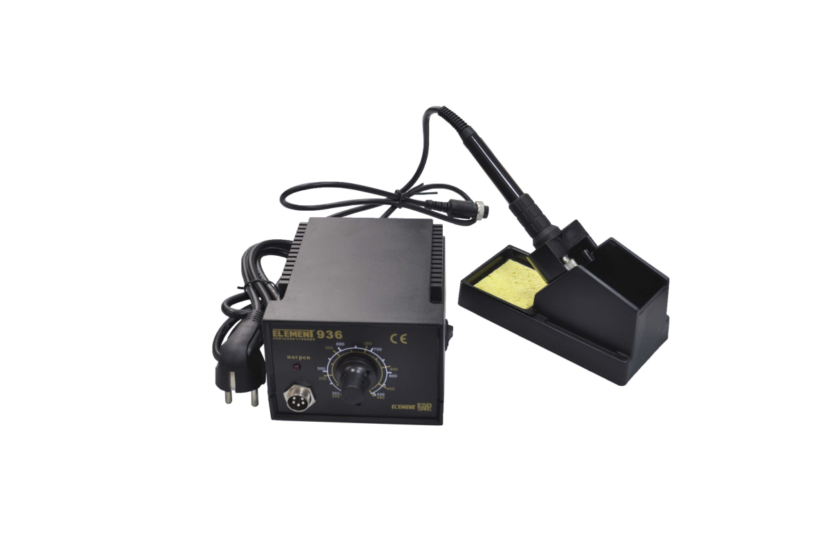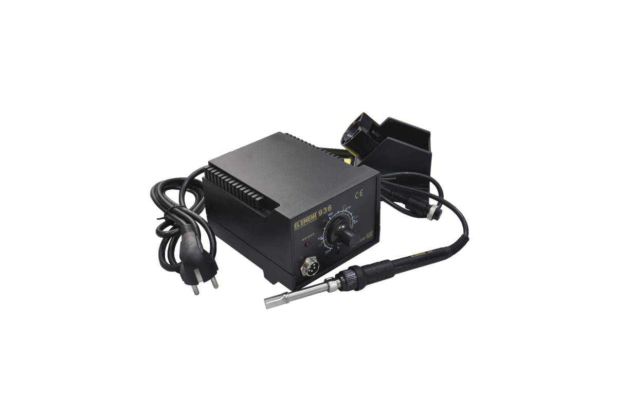 Паяльная станция ELEMENT-936. Характеристики паяльника: ∙ потребляемая мощность: 50Вт, сопротивление заземления жала: <2 Ом, падение напряжения на заземлении: <2 мВ, нагревательный элемент: керамический, длина шнура: 1.2м, длина ручки паяльника: 190мм, вес (без шнура): 45 гр,Характеристики паяльной станции: выходное напряжение: 24В, температурный диапазон 200-480°C, погрешность установки температуры: ±10°C, гарабиты: 120x93x170 мм, вес: 1300 гр