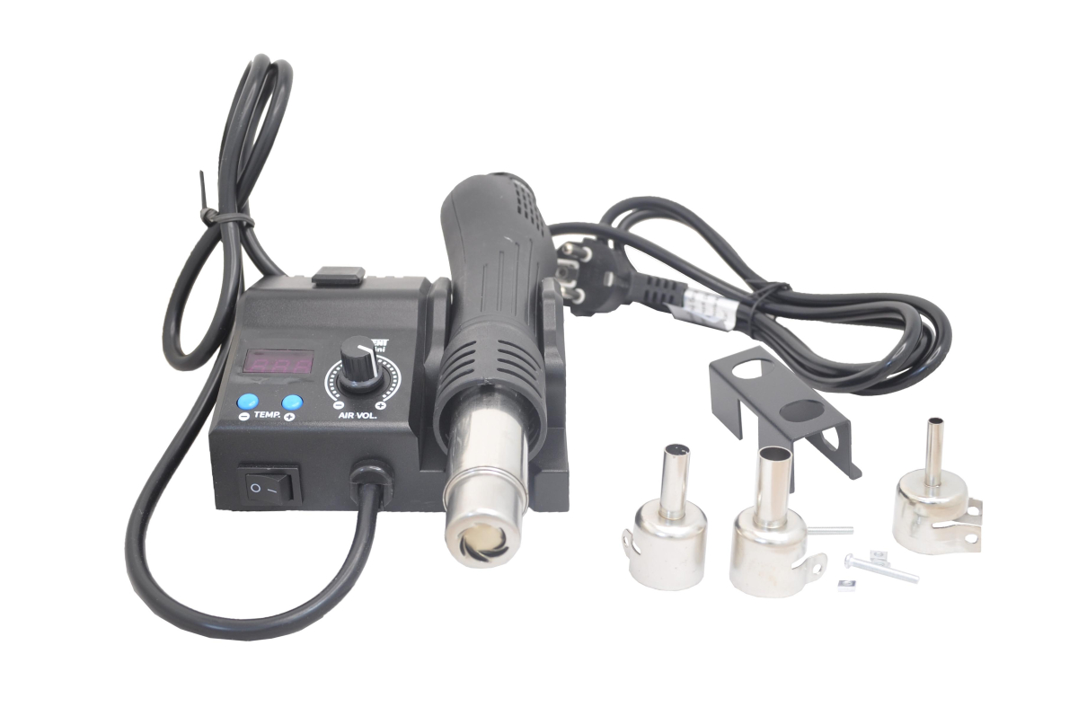 "Паяльная станция с феном для термоусадки, сушки, удаления краски, удаления защитного покрытия, размораживания, предварительного нагрева, пайки клеем и т. д.Температура эксплуатации 0°~50°C/32°F~104°F. Мощность (Вт) 700Вт. Подача воздуха Бесщеточный двигатель с плавной подачей воздуха. Объем воздуха 120Л/мин. Диапазон температур 100°~480°C/212°F~896°F. Дисплей LED. В комплекте 3 насадки для фена"