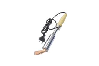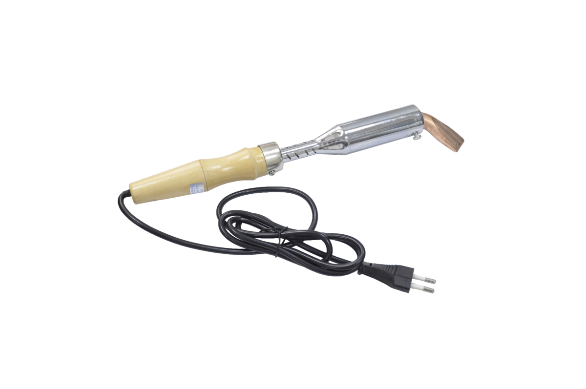 Электрический паяльник с деревянной рукояткой, нихромовым нагревателем и медным загнутым жалом в форме лопатки. Характеристики: мощность: 200Вт, U пит.: 220В, тип нагревателя: нихромовый, тип сетевого штекера: European type 2P round plug(No,6), длина сетевого провода:1,35 м, тип жала: медное, скорость разогрева:3-5 мин