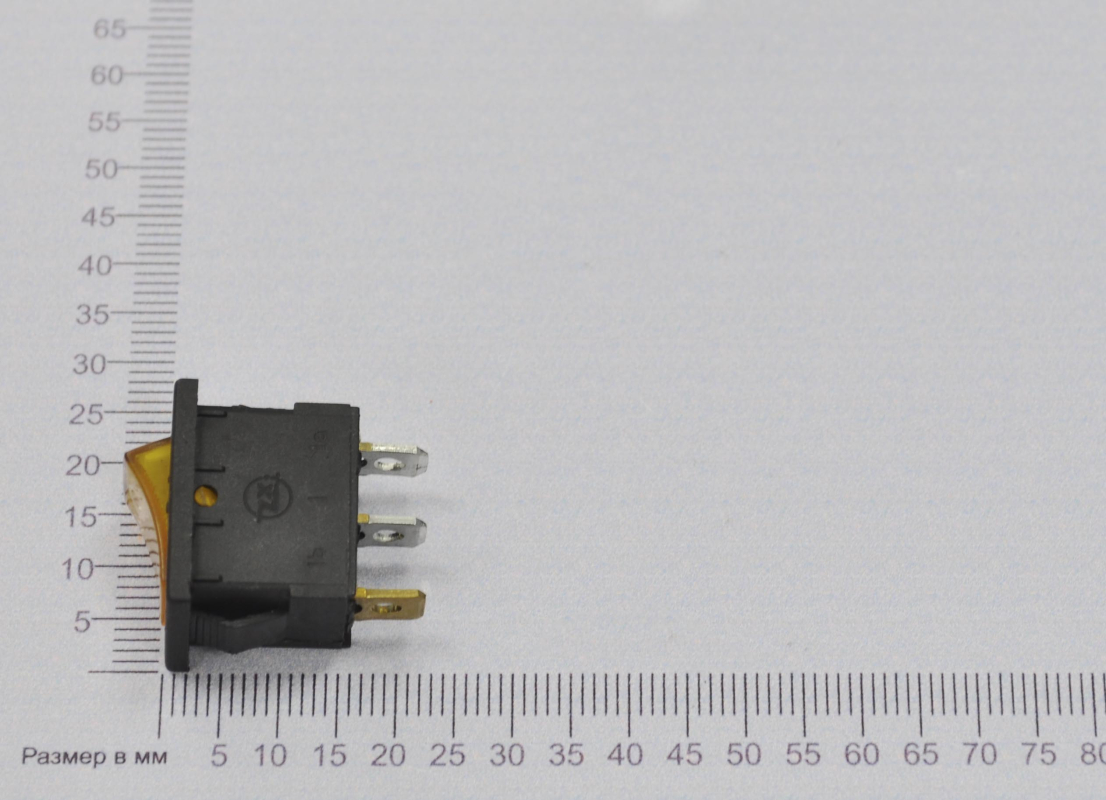 Переключатель клавишный KCD1-B2-101. Параметры: 6A 250V AC / 10A 125V AC T85, 10A 250V AC T28, 10A 250V AC 1/2HP 250V AC, 15A 125V AC 1/3 125V AC, сопротивление контактов: <50mW, сопротивление изоляции: >100MW, диэлектрическая стойкость: >1500VAC/1мин, ресурс: >10000 циклов, 1 полюсный, алгоритм работы: ON-ON, неоновая лампа подветки, желтый цвет, черный корпус
