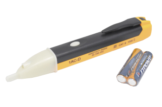 Детектор напряжения 1AC-D. Наконечник прибора начинает светиться красным цветом рядом с розеткой, кабелем или выключателем, находящихся под напряжением. Диапазон измерения AC напряжения 90-1000 В. Частота 50/60Гц. Определение наличия напряжения звук и световой сигнал. Источник света один красный светодиод высокой яркости. Уровень защиты CE CAT II 1000V