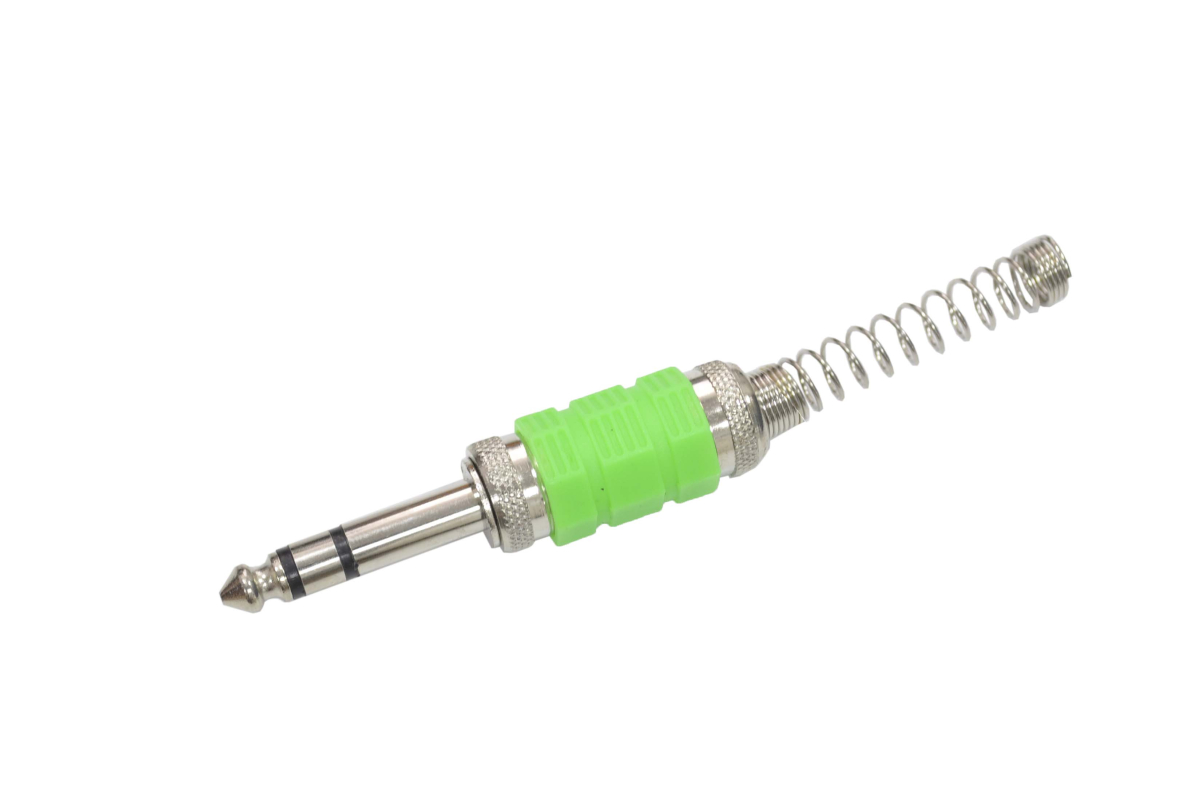 Разъем аудио 6.35мм стерео male (штекер), металл с длинной пружиной, монтаж на кабель, зеленый