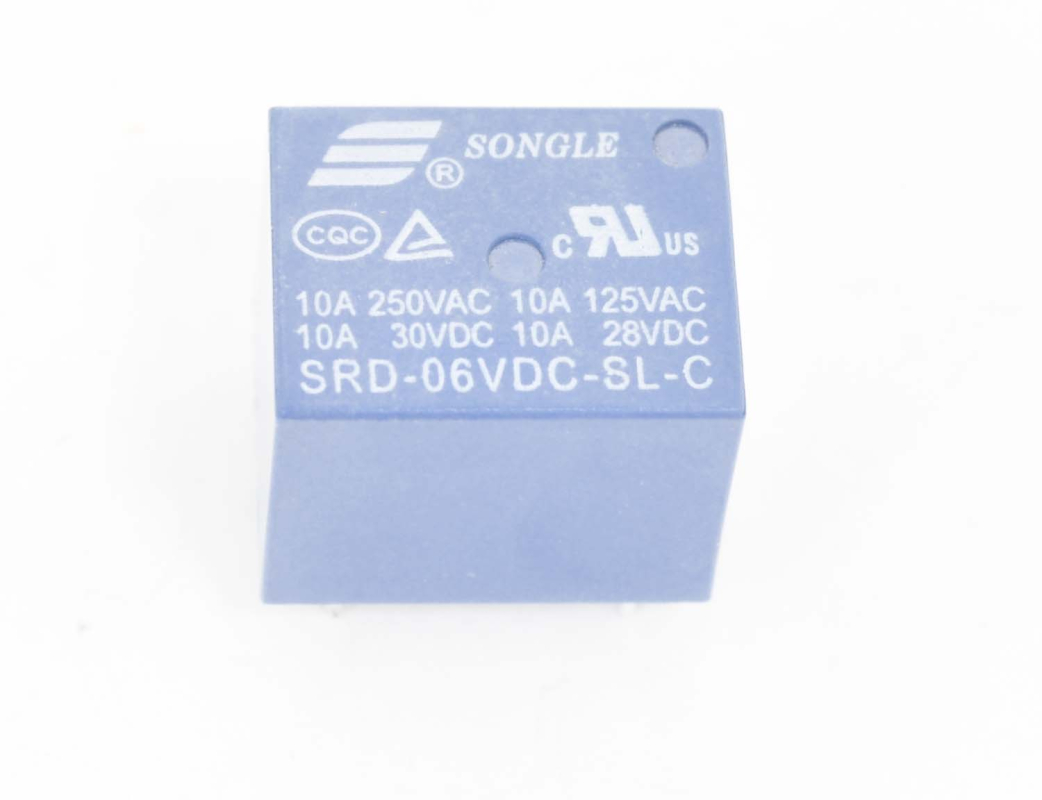 Электромагнитное реле. Одна группа контактов на переключение. Управляющее напряжение: 6 VDC. Номинальное напряжение нагрузки: 250 V. Номинальный ток нагрузки: 10 A. 5 контактов (ножек)